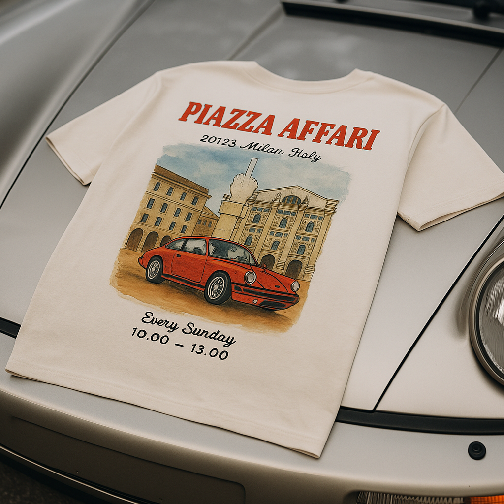 Questa collezione è il nostro omaggio a “Quelli di Piazza Affari”: illustrazioni, colori e design ispirati alle auto simbolo del raduno e allo spirito libero che ogni domenica mattina anima la piazza.