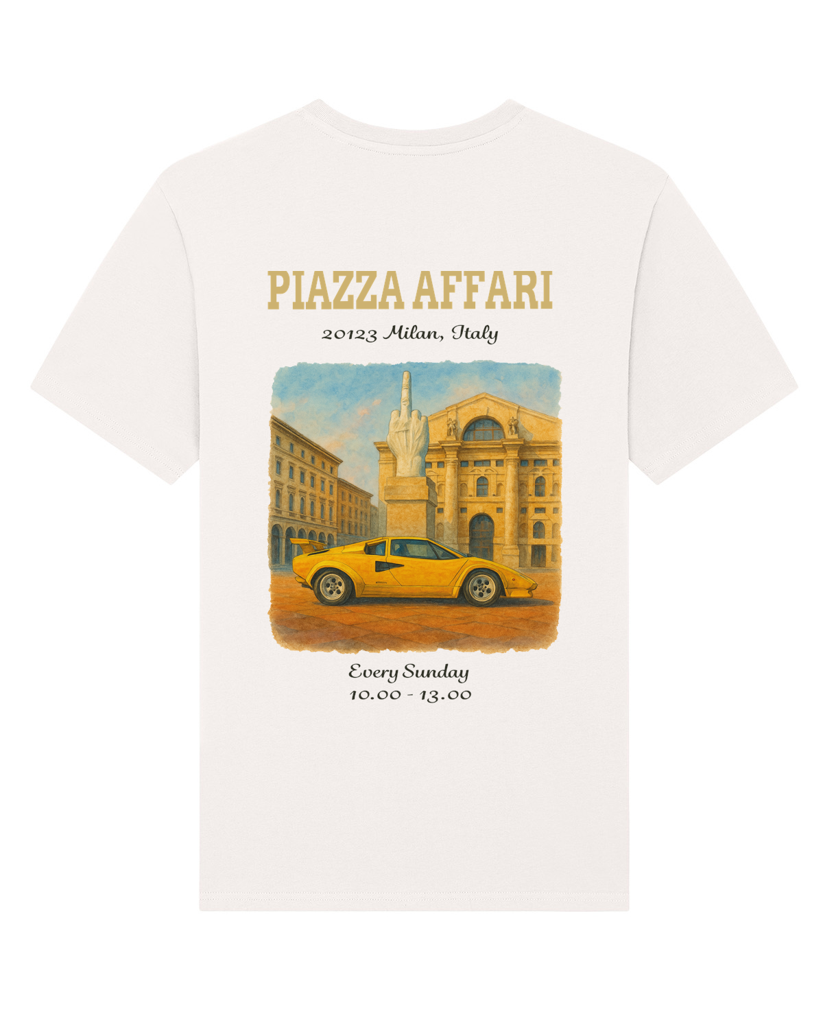 Every Sunday morning, Piazza Affari transforms into a vibrant showcase of classic automobiles, where enthusiasts meet to celebrate automotive heritage. This exclusive t-shirt showcases a stylish graphic of classic cars assembled in front of the historic Palazzo Mezzanotte, home to the Italian Stock Exchange. The design pays homage to the spontaneous "Meeting of Sunday" that brings together car lovers from all over Italy.